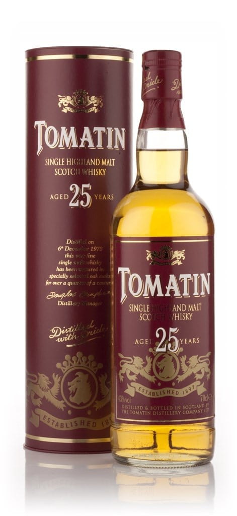 A superb value 25 year old from the Highland distillery, Tomatin, This is more of a Speyside style malt, and it was awarded 93 points at the International Review of Spirits in 2006 with the comment "exceptional quality".