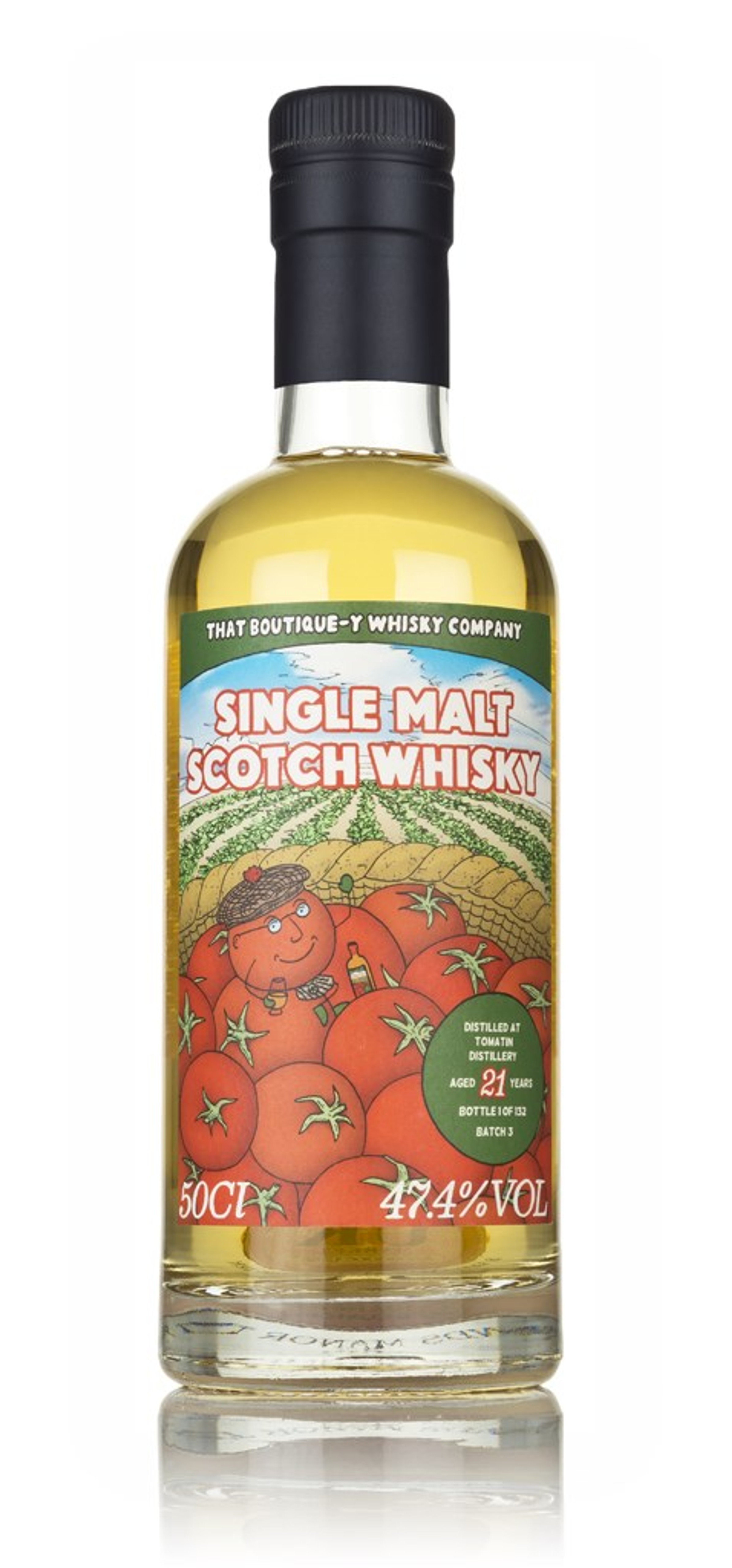 It's the third batch of Tomatin single malt bottled by That Boutique-y Whisky Company, and once again we see the smiling face of an anthropomorphic tomato upon its label. Presumably because Tomatin kind of sounds like a charming colloquialism for a tin of tomatoes. Anyway, yummy 21 year old Highland single malt Scotch whisky here. Dig in.