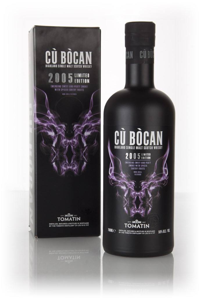 A vintage release of smoky Cù Bòcan single malt from Tomatin from the year in which the distillery first started distilling a small amount of peated malt each year. (The 1988 vintage Cù Bòcan was produced using Islay casks as opposed to lightly peated malt). Matured for over 11 years, 11,400 bottles have been produced.