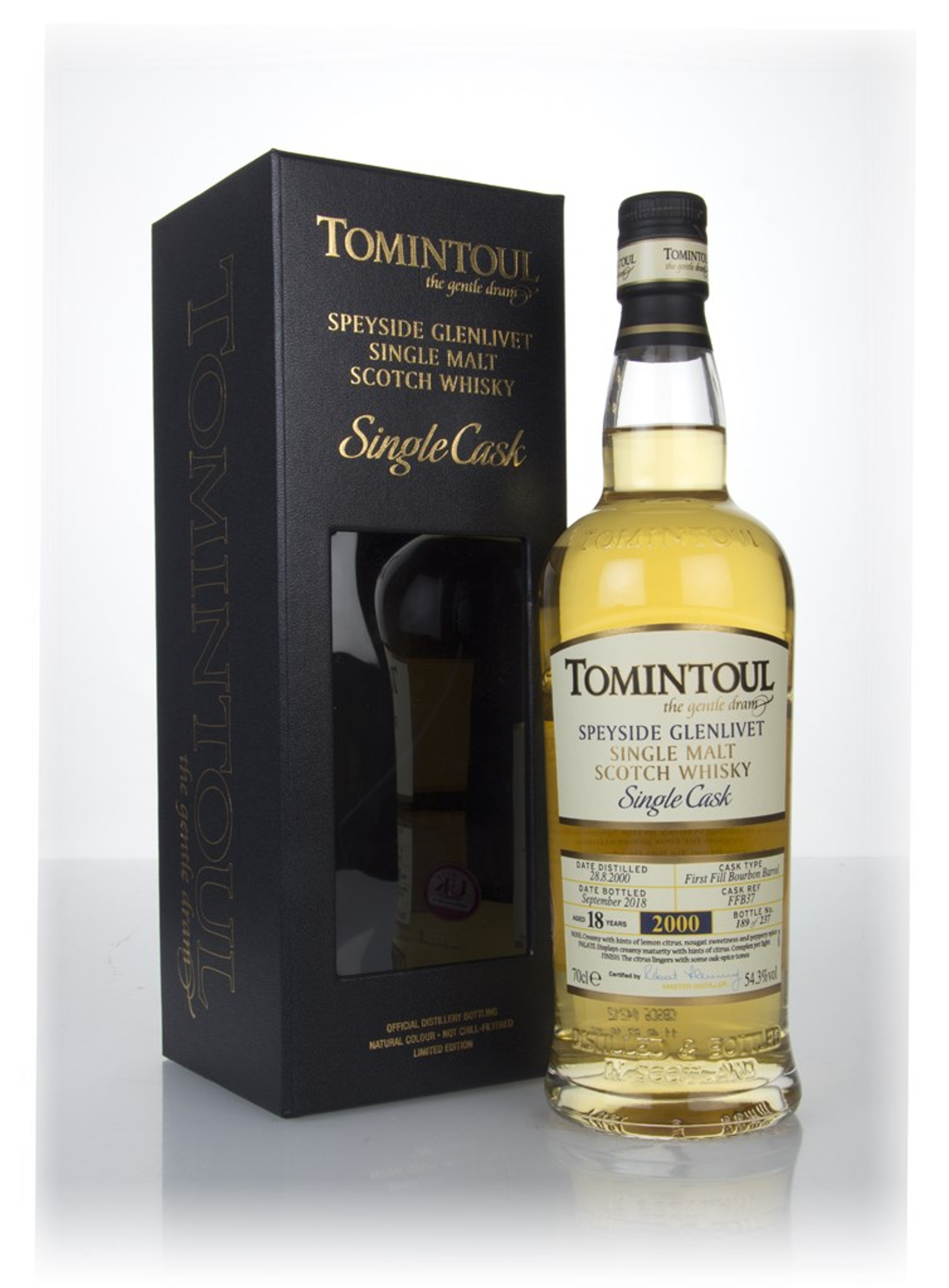 A handsome bottle of Tomintoul single malt, distilled on 28 August 2000. It matured patiently in a single first-fill bourbon barrel for 18 years, and was bottled just after its birthday in September 2018. Only 237 bottles were released of this tasty whisky. A gentle dram indeed.