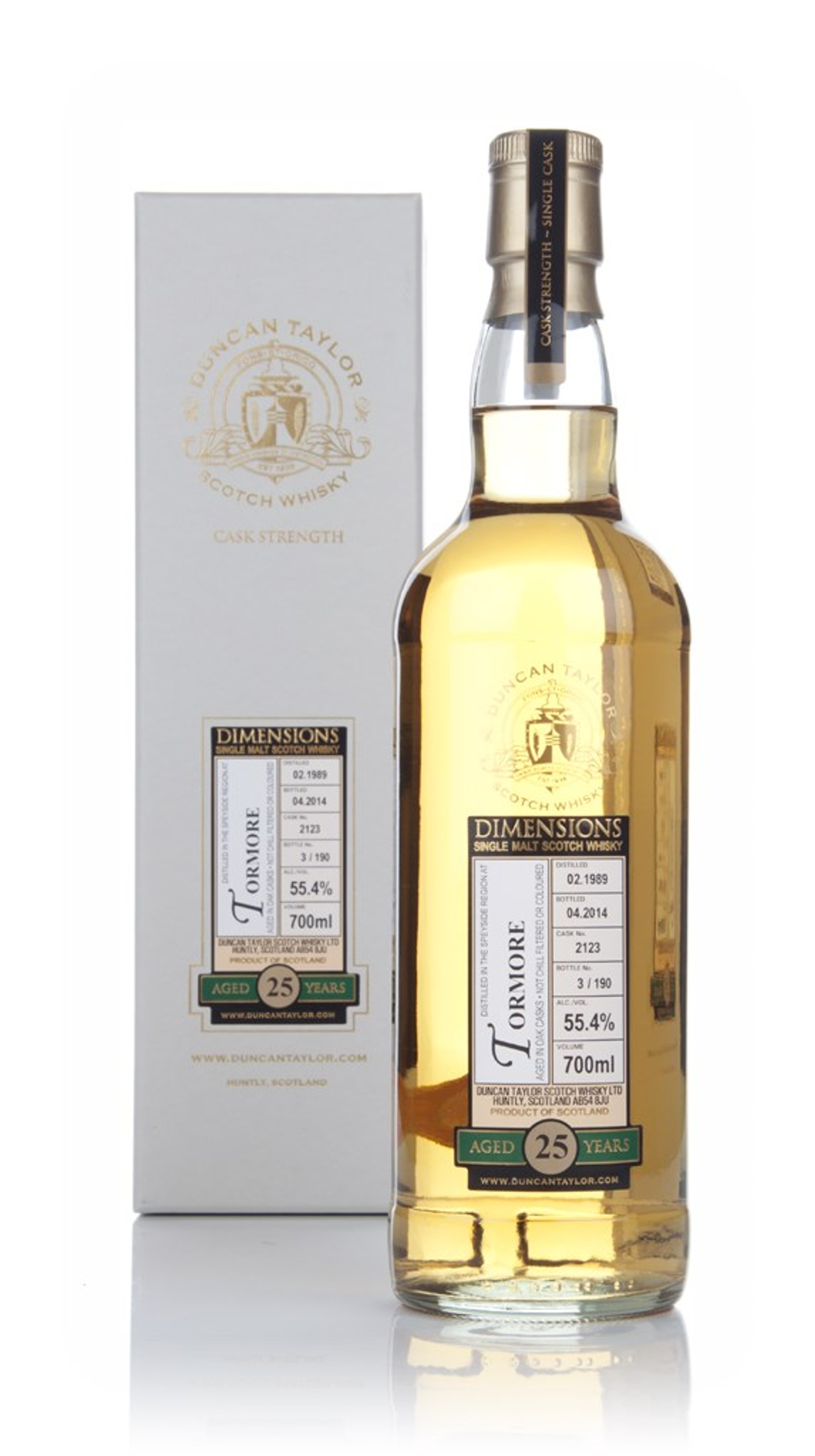This 25 year old single cask single malt Scotch whisky comes from the beautiful Tormore distillery in Speyside. It was distilled in February 1989 and bottled by Duncan Taylor in April 2014 with an outturn of 190 bottles. Part of the Dimensions range, designed to show off the "dimensions" of the Duncan Taylor collection.