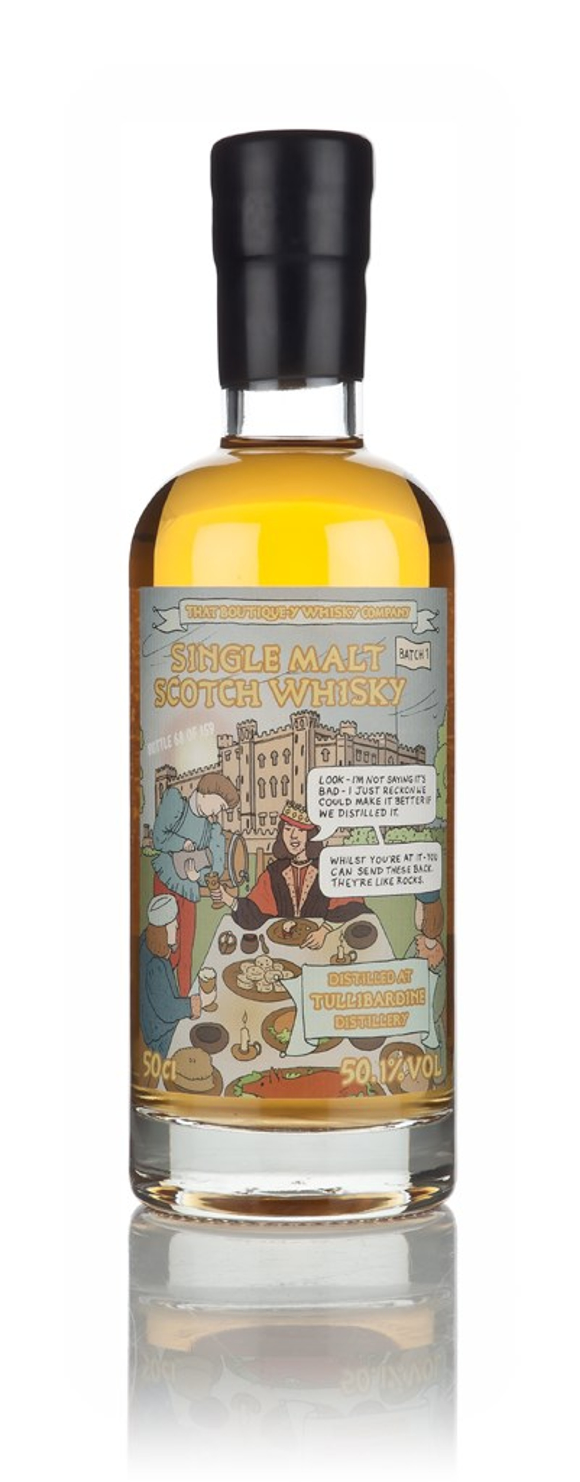 This is the first batch of single malt Scotch whisky from the Tullibardine distillery bottled by That Boutique-y Whisky Company! As with their other release, this comes with an excellent illustration on the label depicting lore and in-jokes from the whisky world. History buffs might recognise the chap at the head of the table on this one - it's King James IV! On the way to his coronation (at Scone), James IV allegedly bought some ale from brewers on the site where the Tullibardine distillery stands today! However, he seems to think distilling the ale would make it better! Reckon he might be on to something with that idea...
