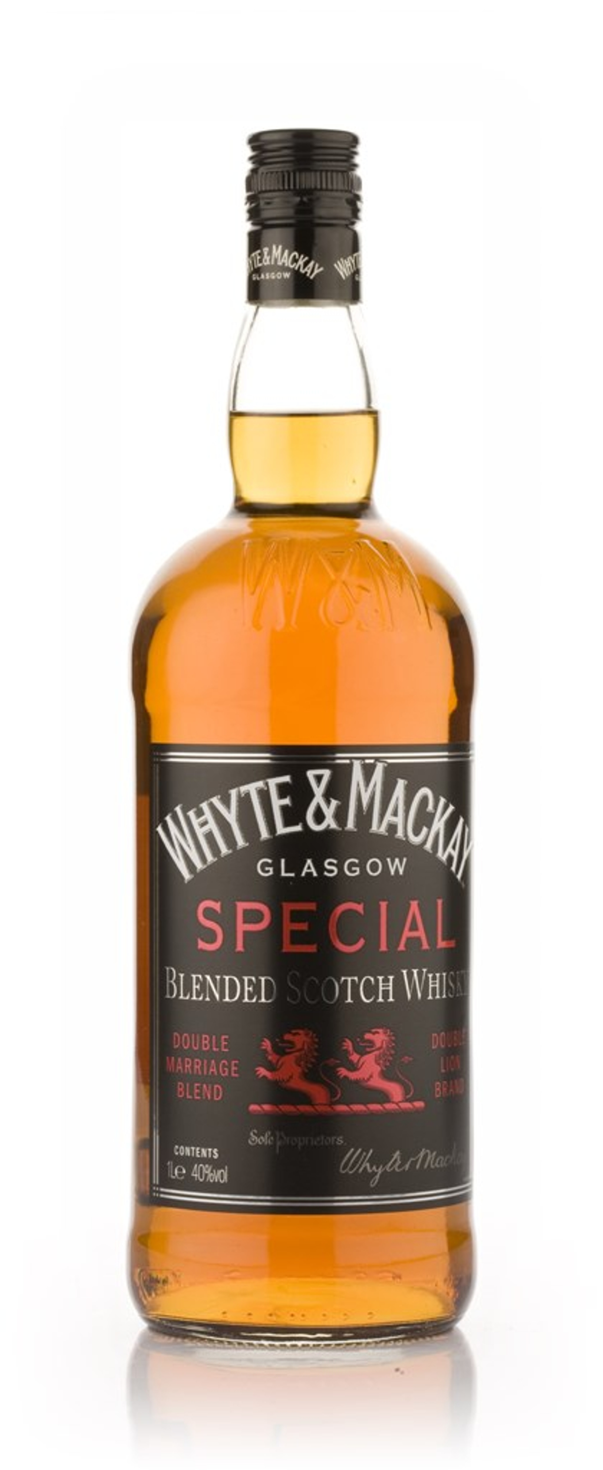 A litre bottle of Special blended whisky from Whyte and Mackay. Carefully made to the same exacting standards of the company's founders.